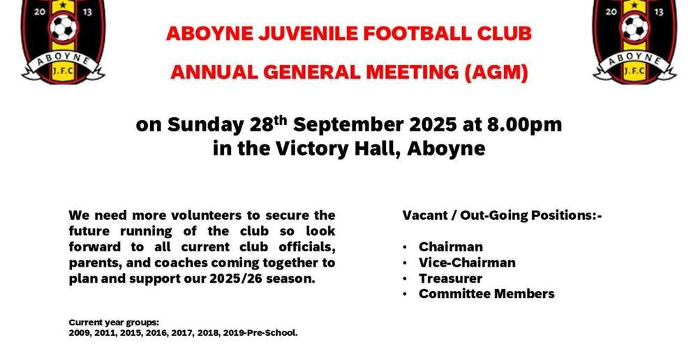 Aboyne Juvenile FC are holding their AGM on Sunday 28th September 8pm at the Victory Hall.